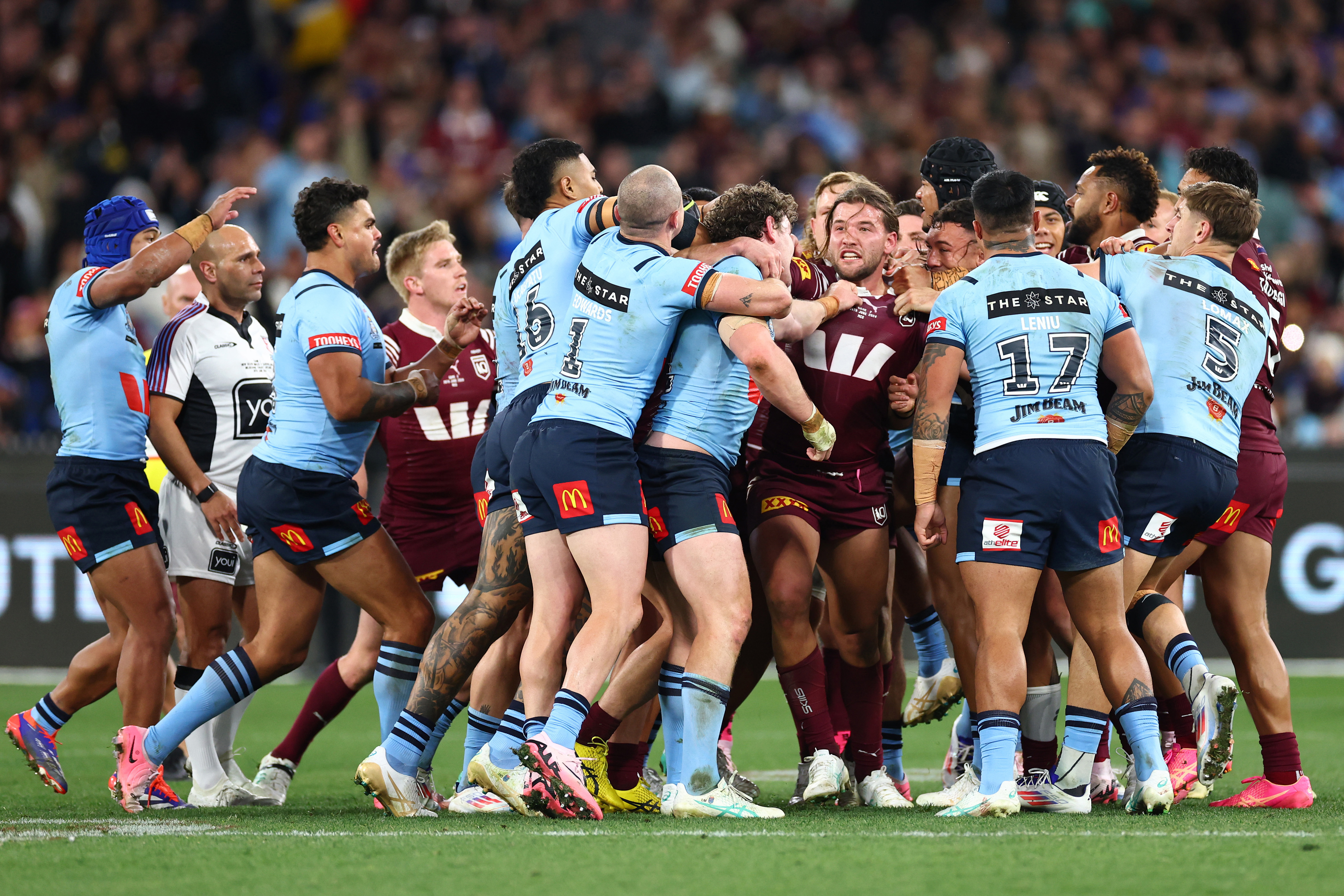 Queensland and NSW were left down a man in the second half of Origin II after a melee broke out following a big Spencer Leniu hit with Liam Martin and Patrick Carrigan binned.