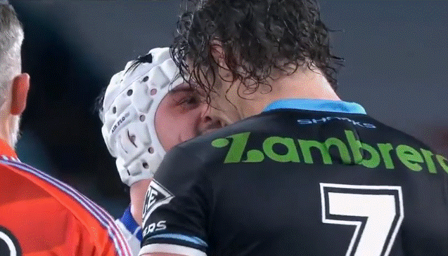 Tempers flared on the sidelines on the stroke of half-time, with renowned niggler Mahoney getting under the skin of Sharks halfback Nicho Hynes as they exchanged words before teammates came in and separated the pair.