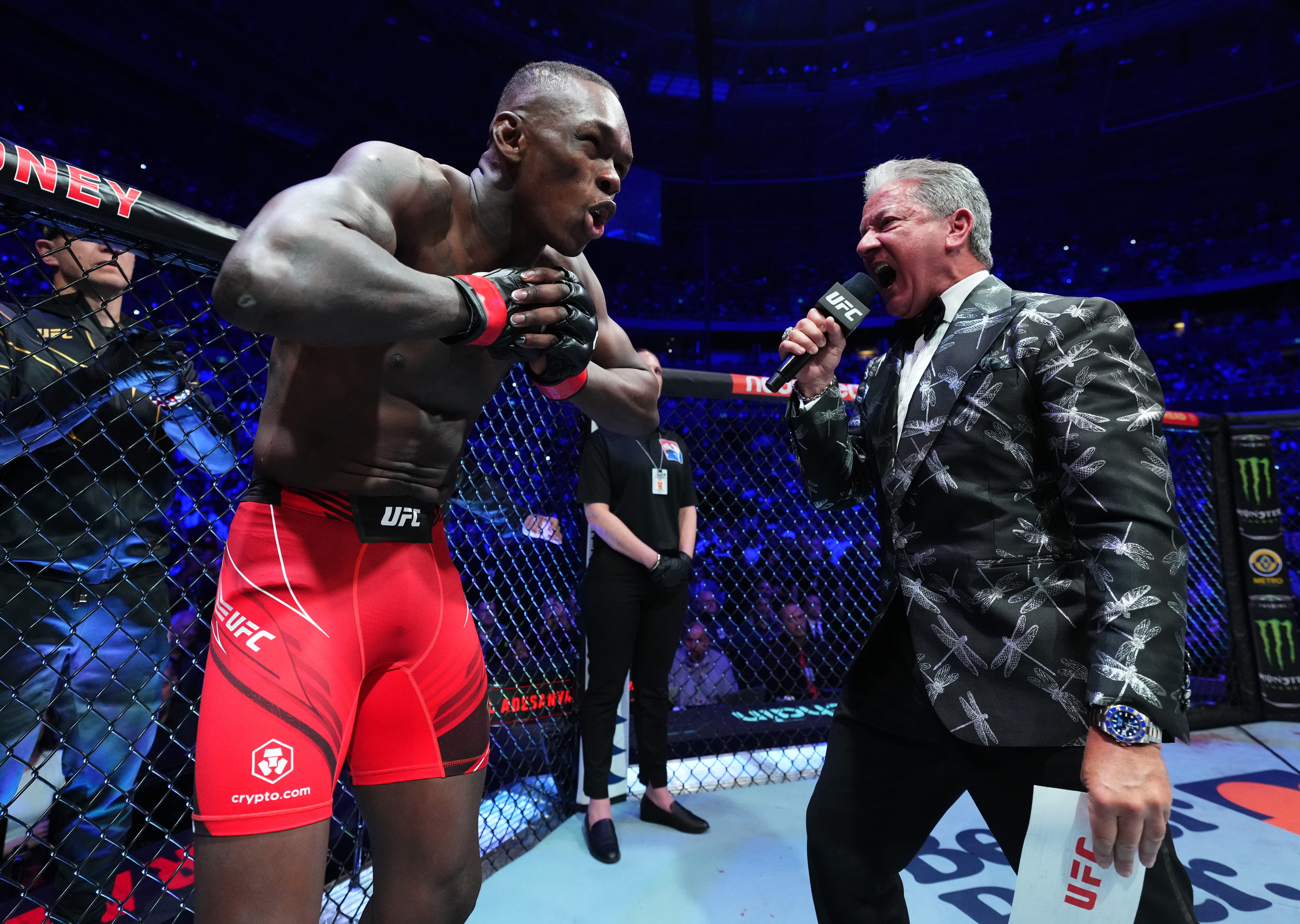 After trading barbs on the microphone, Adesanya and du Plessis engaged in a lengthy staredown on the stage, before being separated by UFC staff and security.