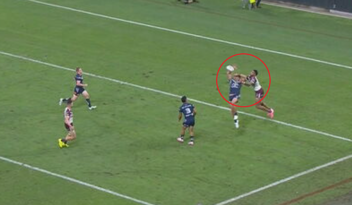 In the 60th minute of Manly's win over the Cowboys, winger Jason Saab was involved in a contentious call that almost led to him securing a double hat-trick.
