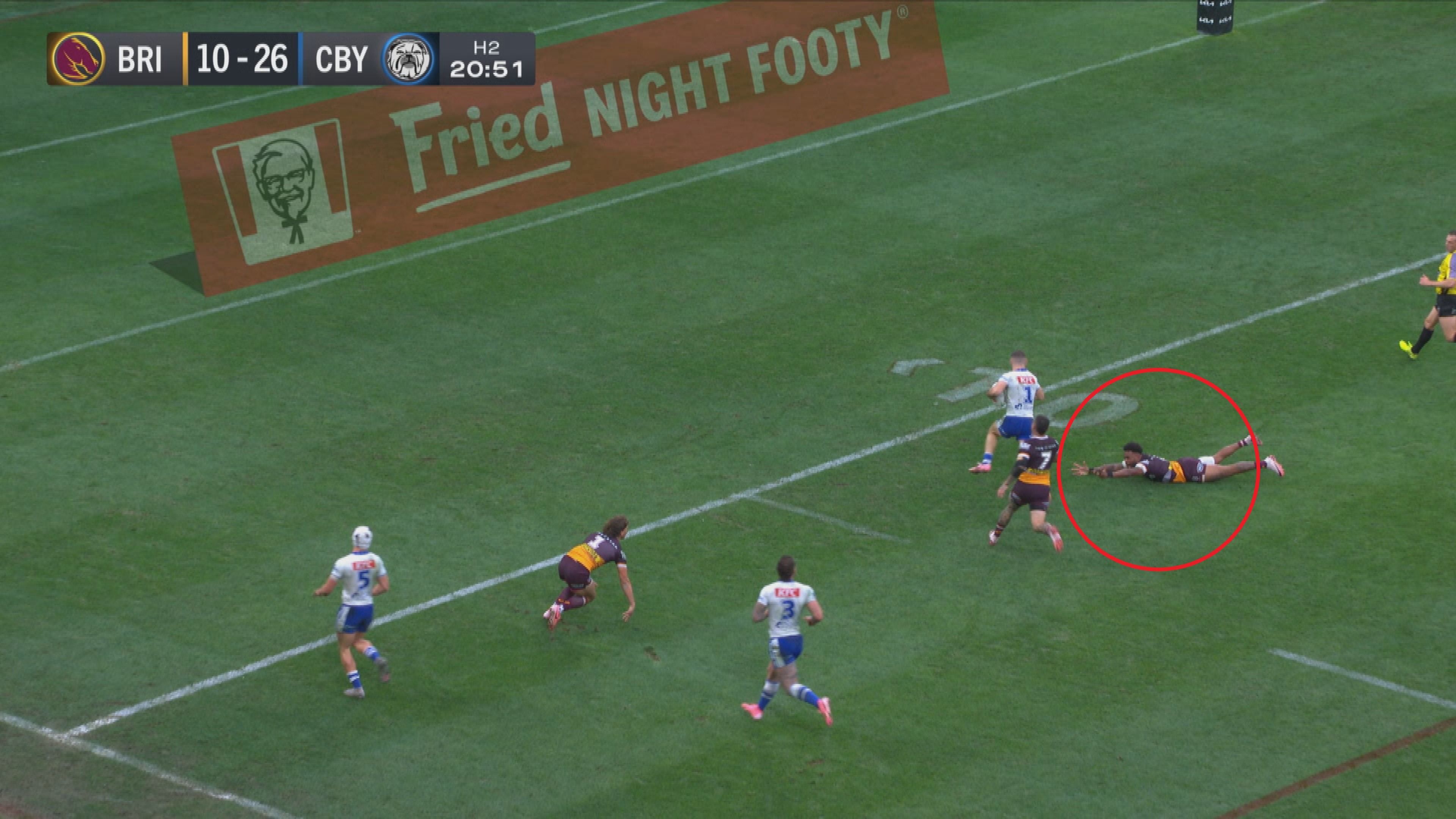 The four-pointer made it 26-10 in the second half, with the Bulldogs attacking down the left side. Mam attempted to come across in cover defence but was captured sliding on the ground with his hands up.