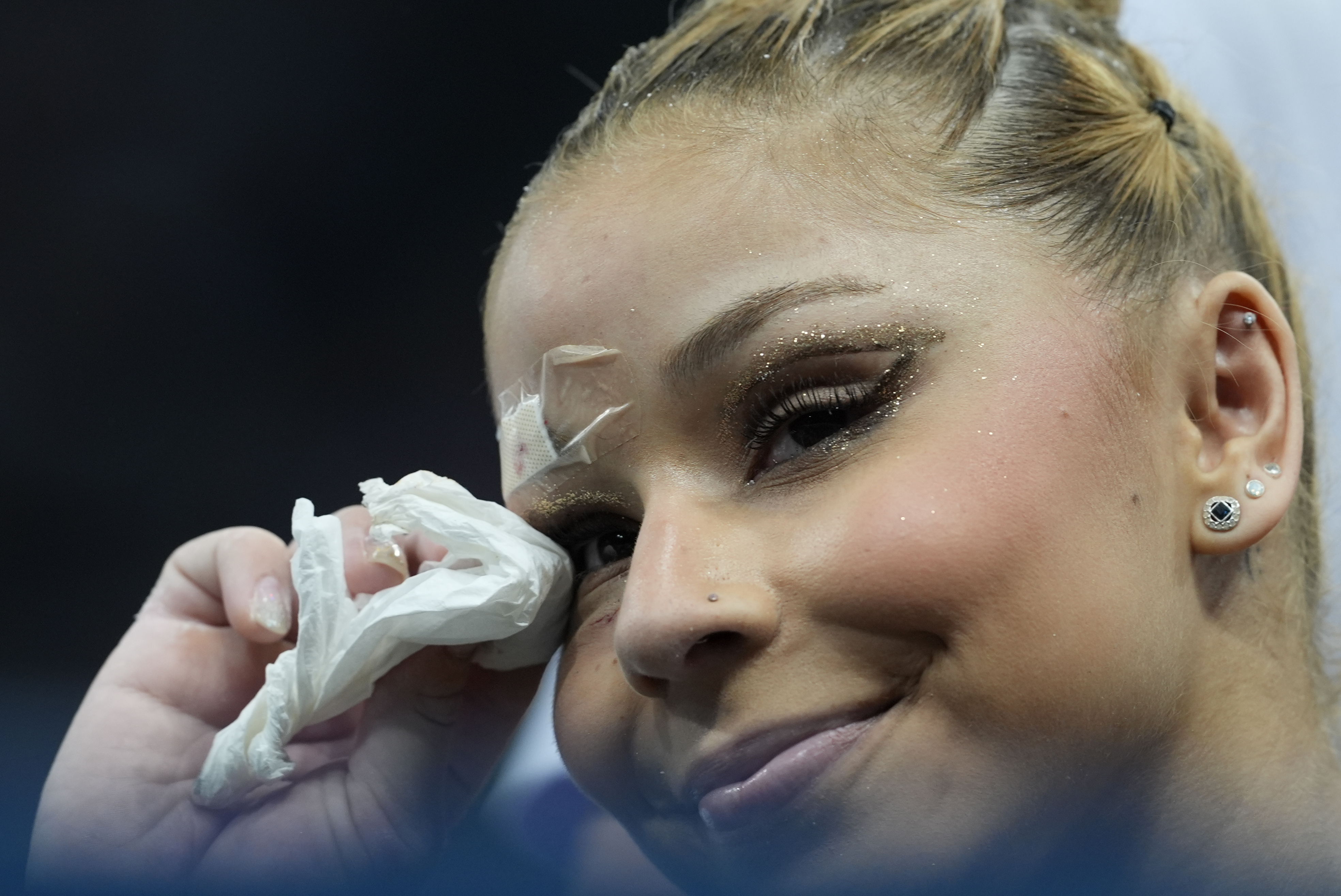 She later appeared at the all-around team finals with a bandage over her eye.