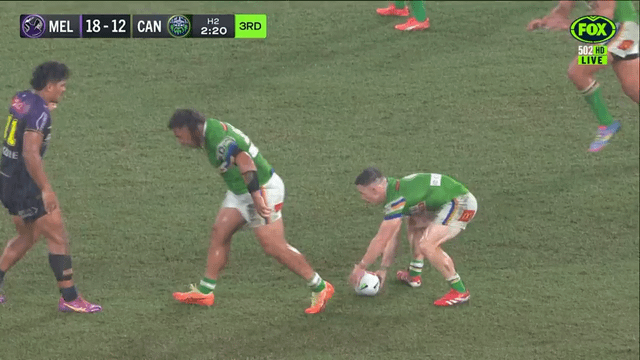 I posted a fantastic try scored by Storm against Raiders from an in-play kick earlier. This is another from the same game but a different type of in-play kick. submitted by /u/nikkynackyknockynoo |