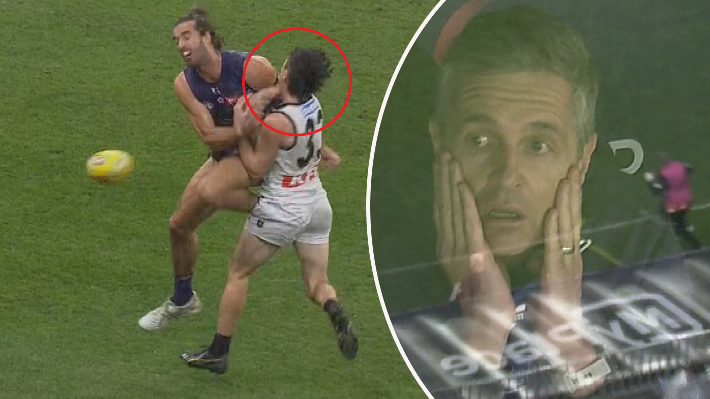 "Just the last split second when you take your eye off the ball you're going to be in trouble. I think originally he was looking for the mark but then you've got to protect yourself and sometimes you come off second best," Adam Simpson said on Fox Footy.