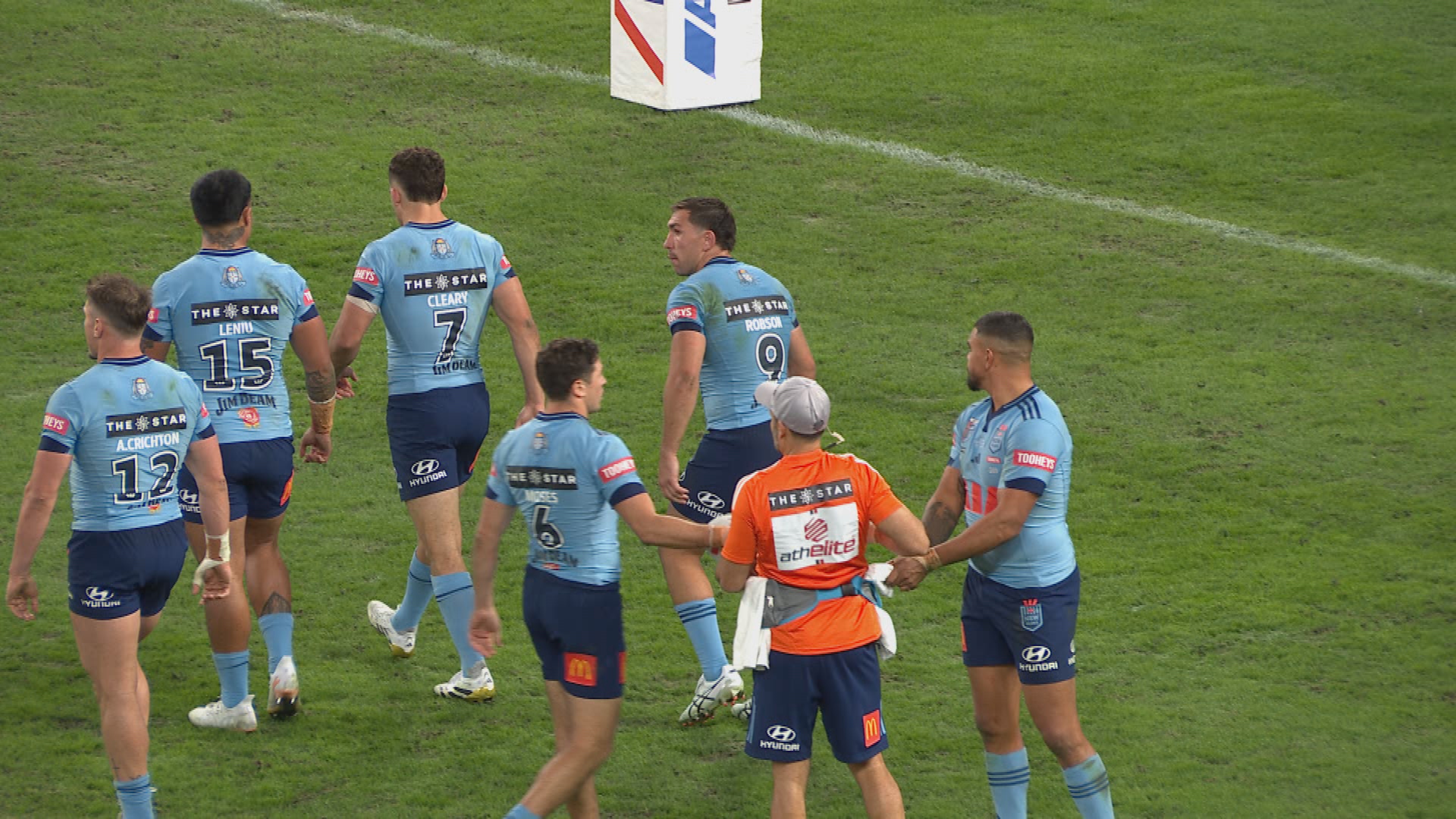 Blues players grabbed water from the trainer before he picked the ball up and gave it to Mitch Moses. Moses then threw the ball away with Daly Cherry-Evans pointing towards him.
