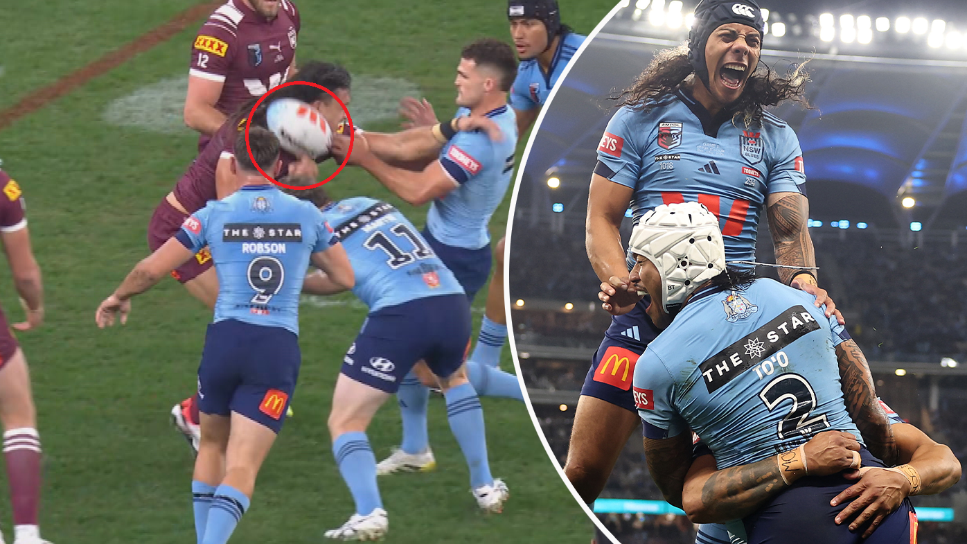 In the seventh minute, Nathan Cleary was penalised for a strip on Tino Fa'asuamaleaui, 20 metres out from Queensland's line.