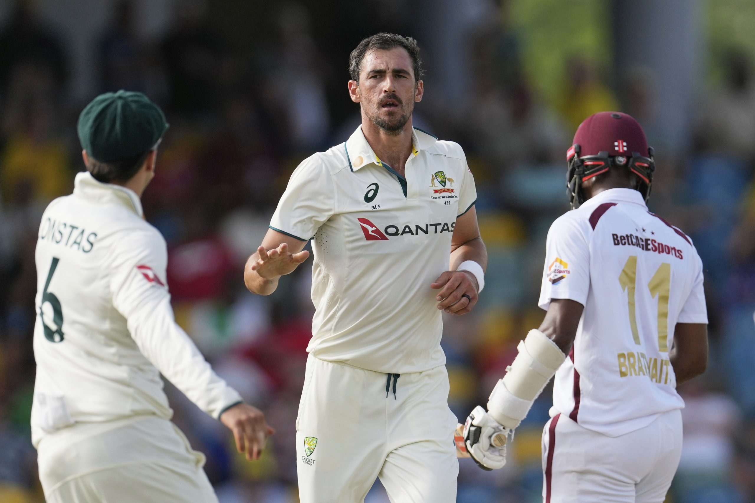 Starc grabbed the first two wickets, dismissing Kraigg Brathwaite (4) and John Campbell (7).