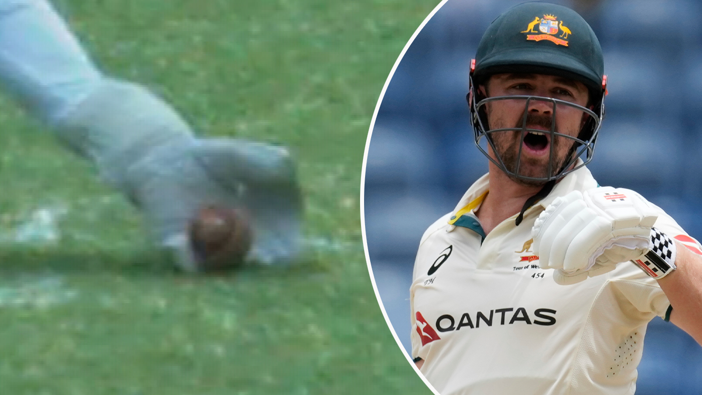 Head was shortened up by a brute of delivery from Shamar Joseph and let out a loud gasp when he edged behind to Shai Hope.