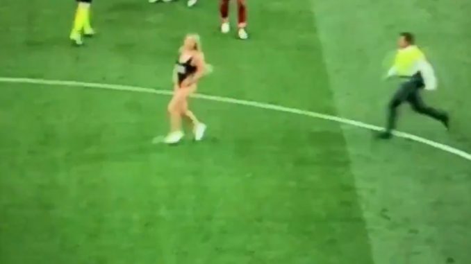 The sexy blond made headlines Saturday when she ran onto the pitch at Madrid’s Wanda Metropolitano in a swimsuit promoting her prankster’s boyfriend’s porn site.
