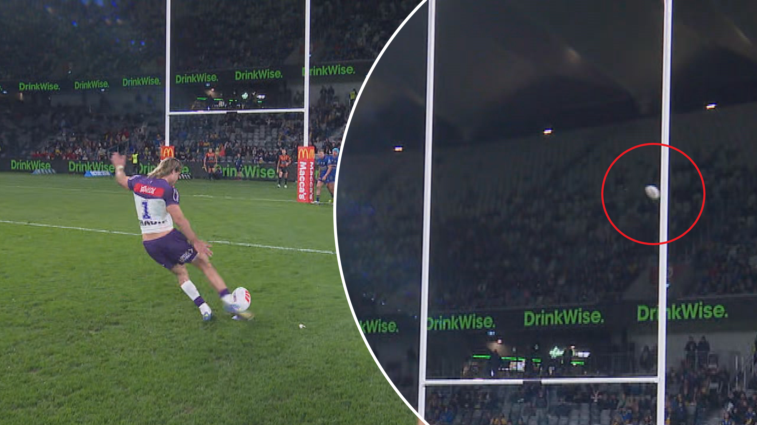 But despite crossing right next to the posts, Papenhuyzen was unable to convert as the ball hit both uprights and bounced out in a bizarre moment.