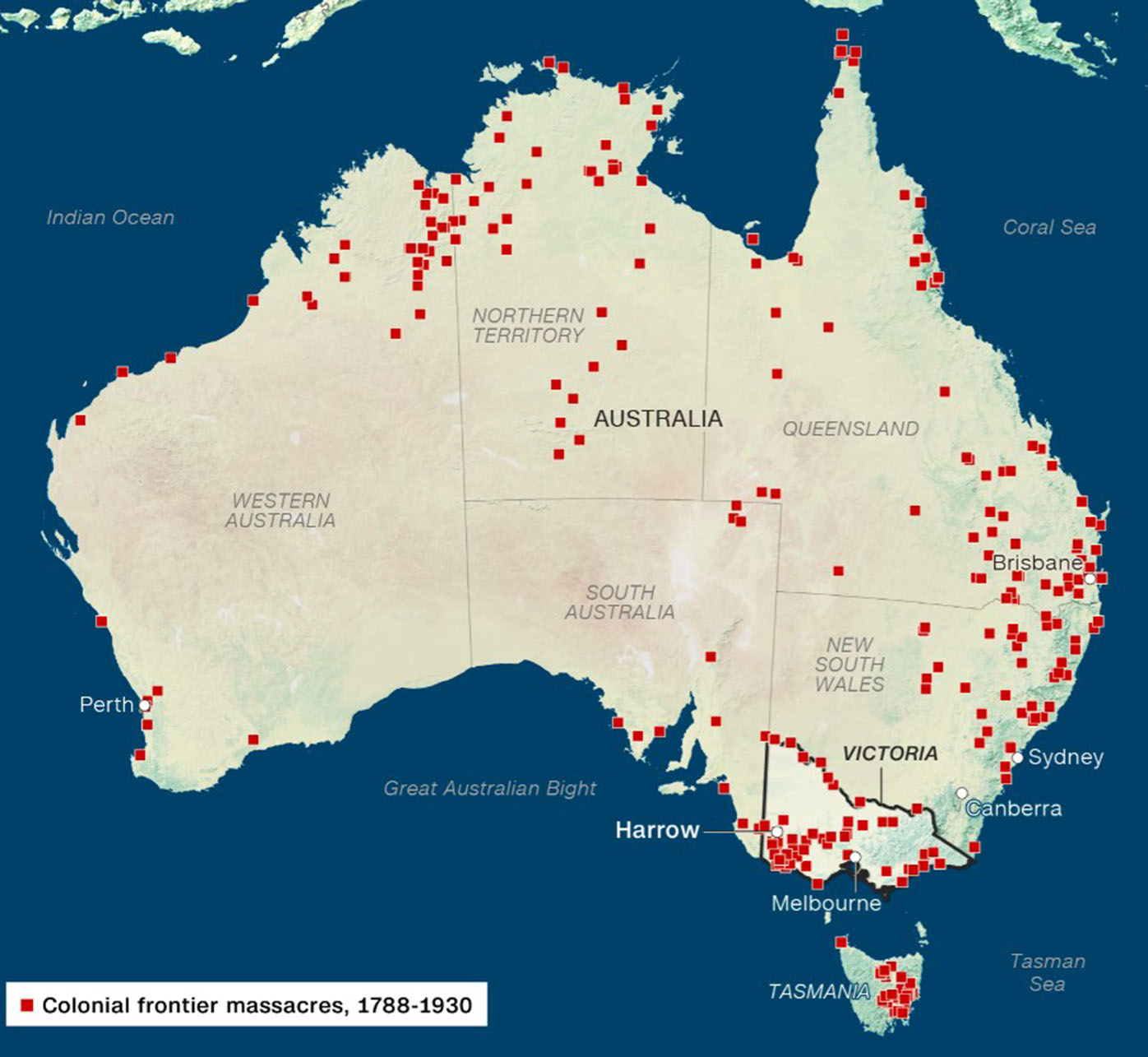 Without their traditional food sources, Kennedy said some Aboriginal people began to take sheep from farms. If caught, they and their families could be shot. The University of Newcastle's map of colonial frontier massacres in Australia — still incomplete — records 56 massacres of over 1,200 Aboriginal people by colonisers in what is now the state of Victoria. The atrocities that have recorded so far occurred in that region between 1834 and 1859.