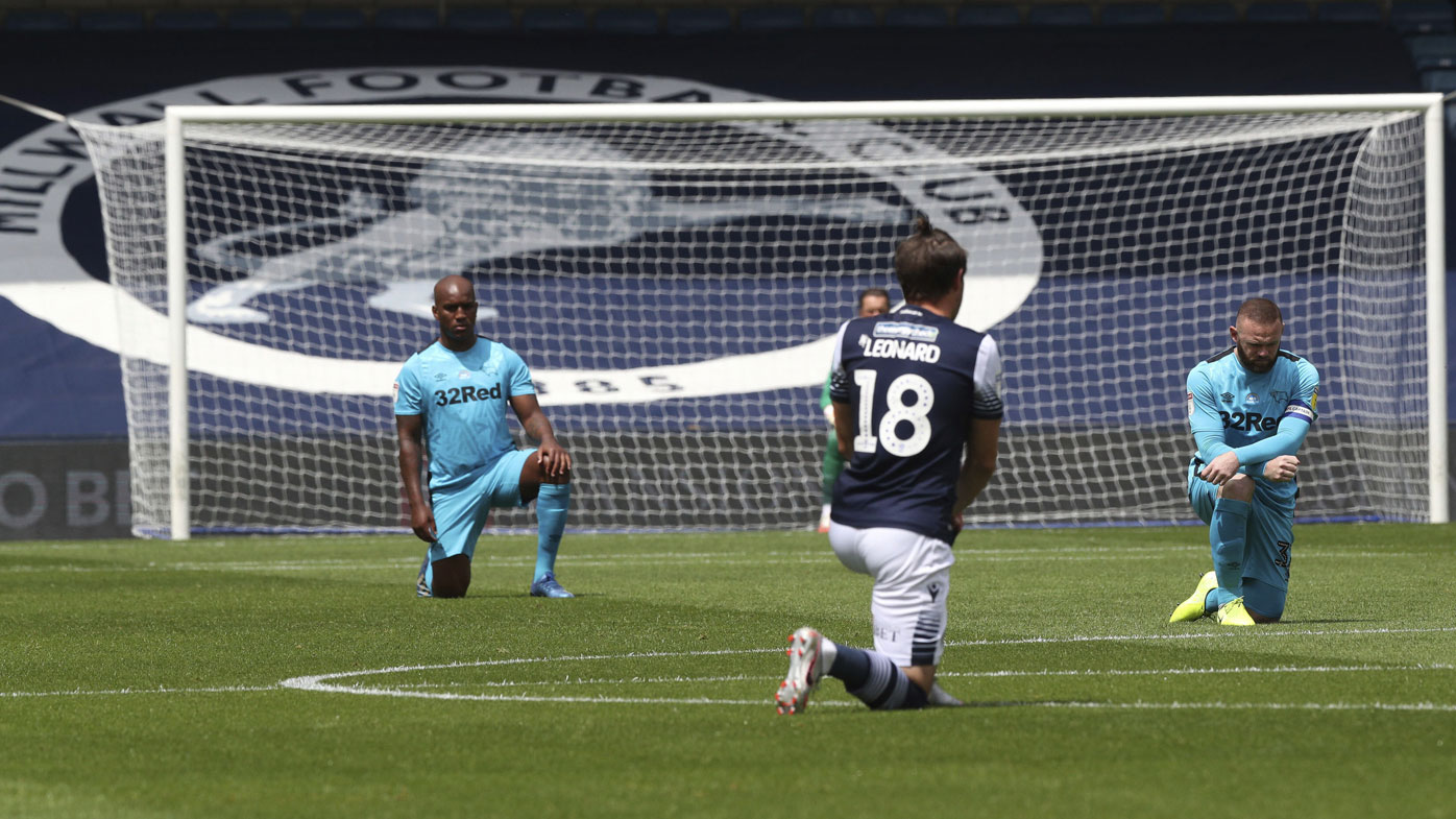 Spectators at English football club Millwall marked the return to stadiums by booing as players took a knee before Saturday's game against Derby County.