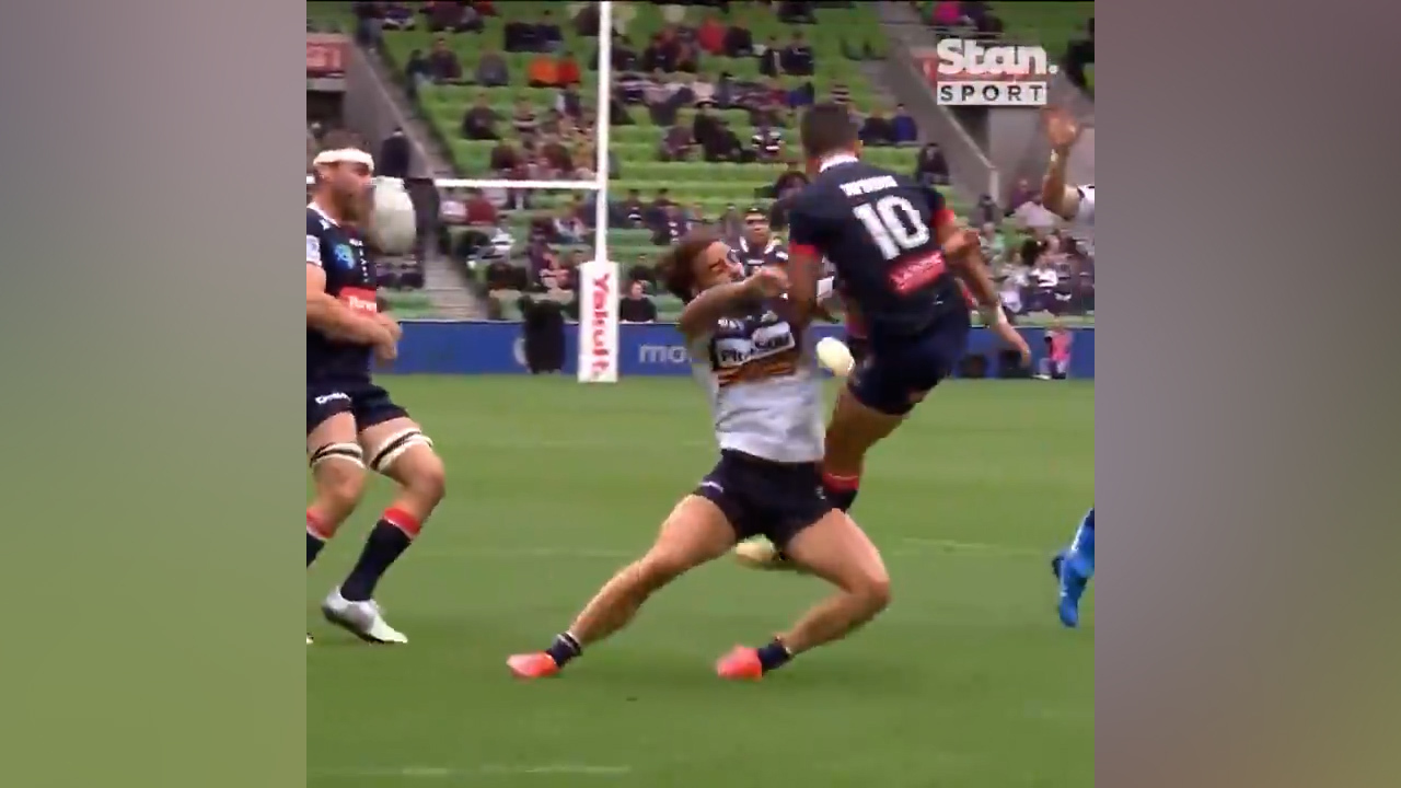 What's been kindly described as an "all-time falcon blunder" gifted the Brumbies a critical try, as Rebels fly half Matt To'omua was pressured into a hurried clearing kick which hit teammate Josh Kemeny square in the face.