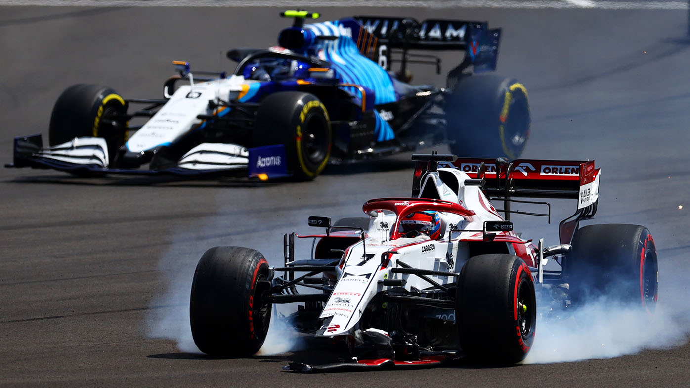 The safety car came out on Lap 2 for debris on the track as veteran Kimi Raikkonen lost his front wing and went off into gravel after clipping the left rear tyre of his Alfa Romeo teammate Antonio Giovinazzi.
