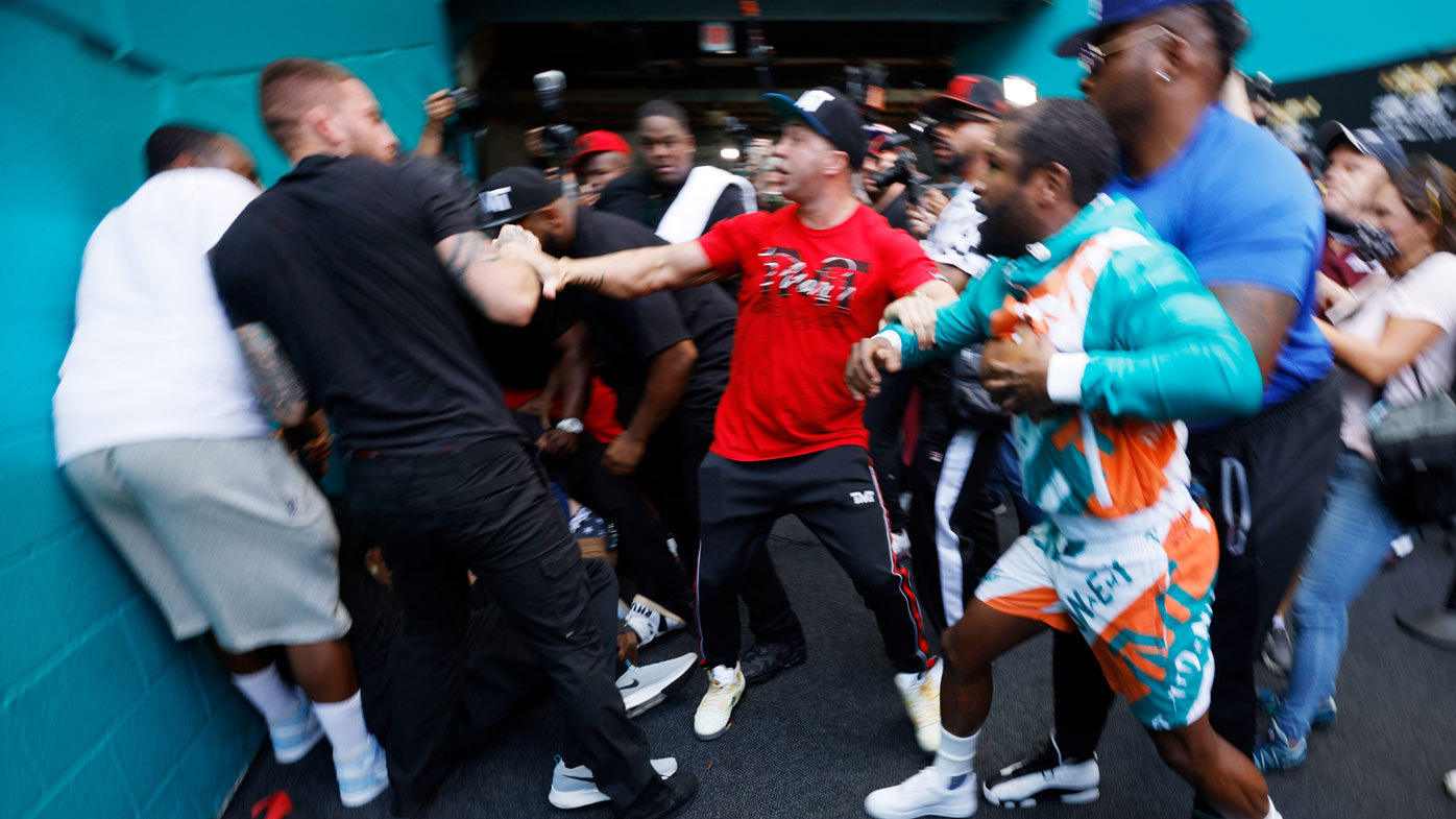 As they were separated, Mayweather was seen being dragged away only returning for another piece but it's not clear whether he landed any punches.