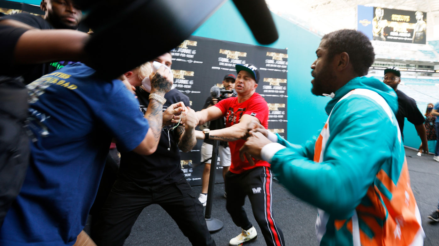 The boxing great erupted and chased down the 24-year-old as security grabbed him and a melee ensued with Mayweather's entourage getting involved along with Paul's brother.