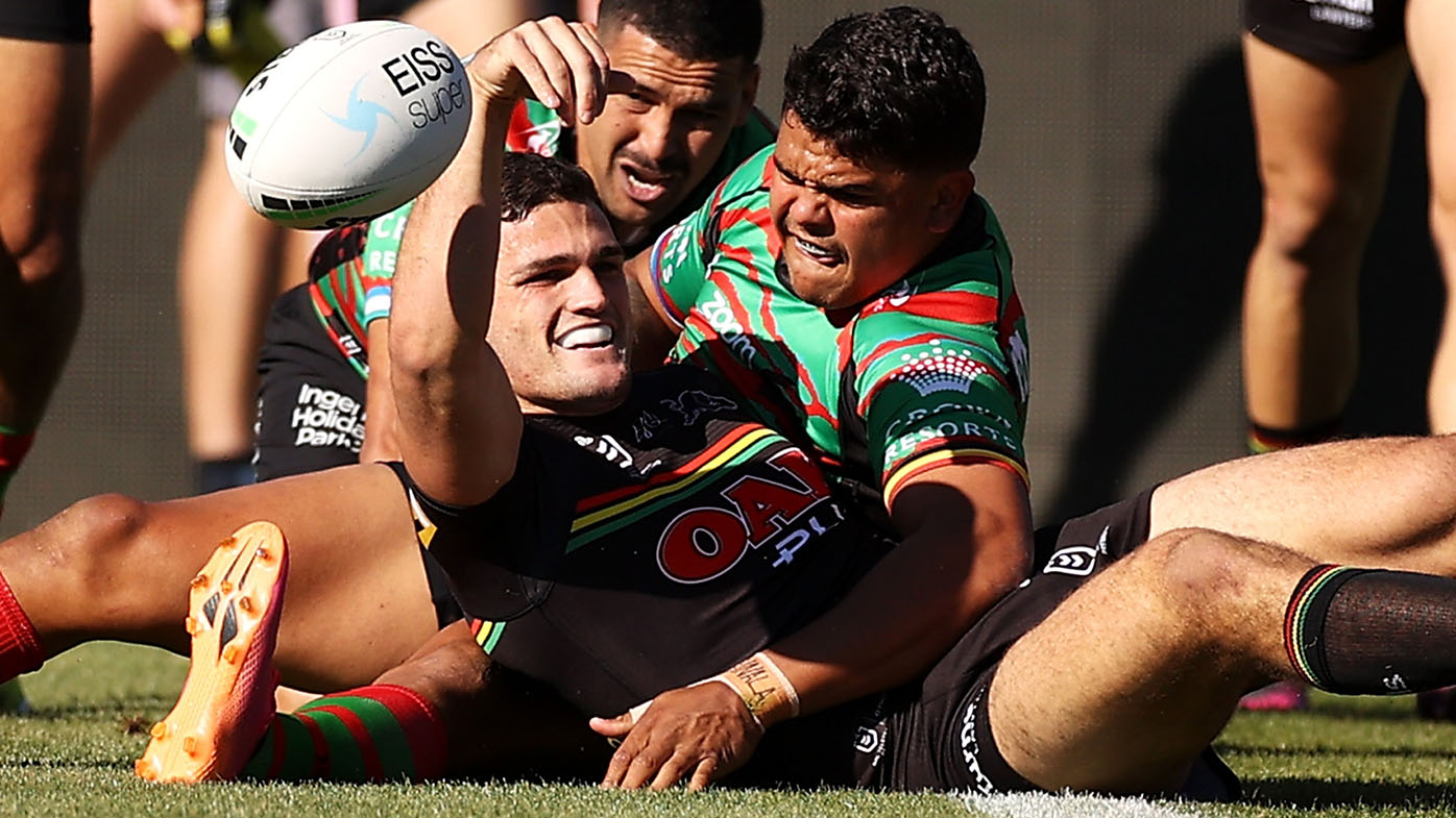 The 15-game young gun's first try came in the 26th minute when he got on the end of a slick chain of passes involving halfback Nathan Cleary and five-eighth Jarome Luai.