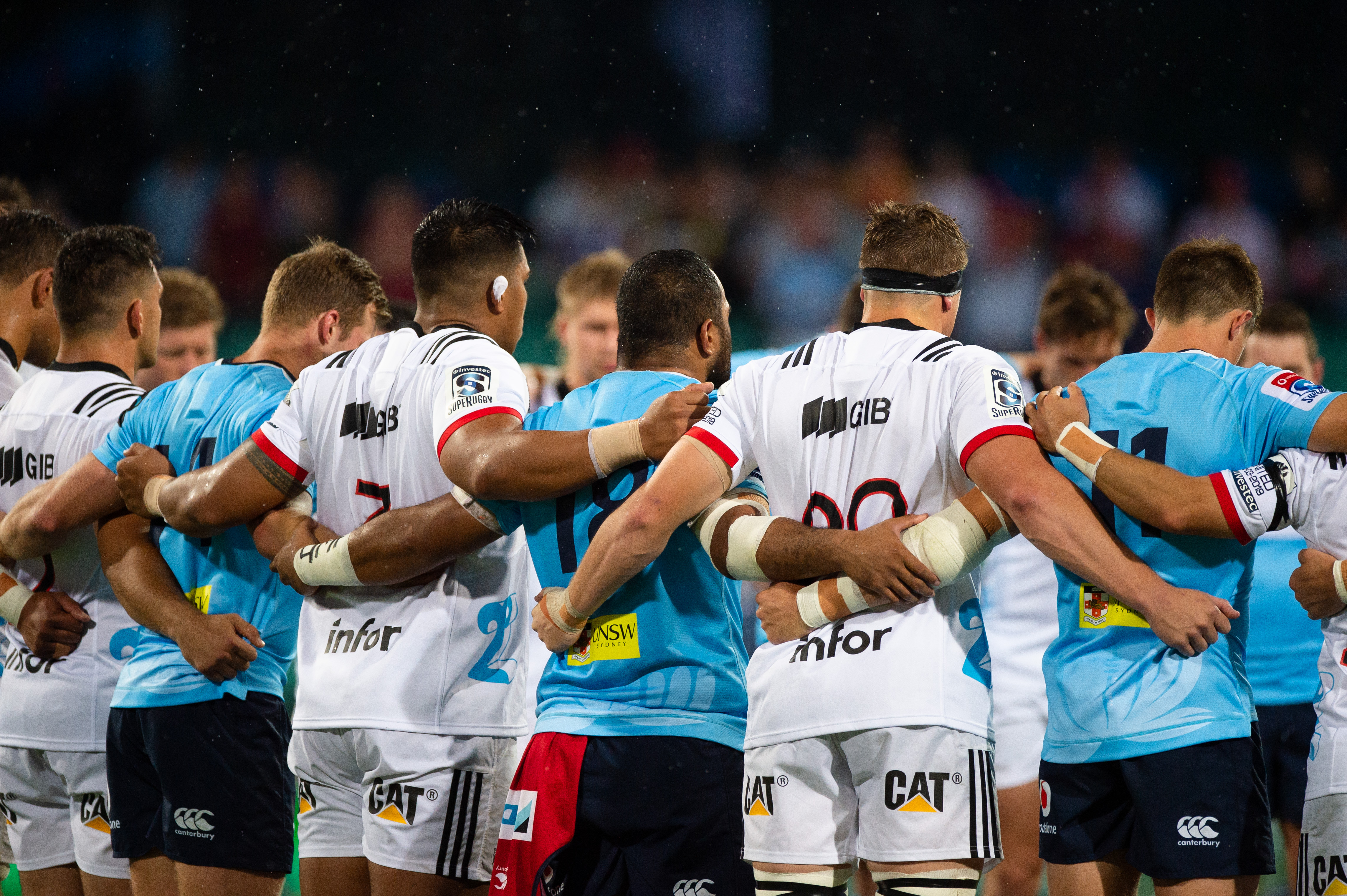 Players from both sides huddled shoulder to shoulder in solidarity for a minute's silence before the match, won 20-12 by the Waratahs in a major upset against the now 12 time Super Rugby champions (two Aotearoa titles included).