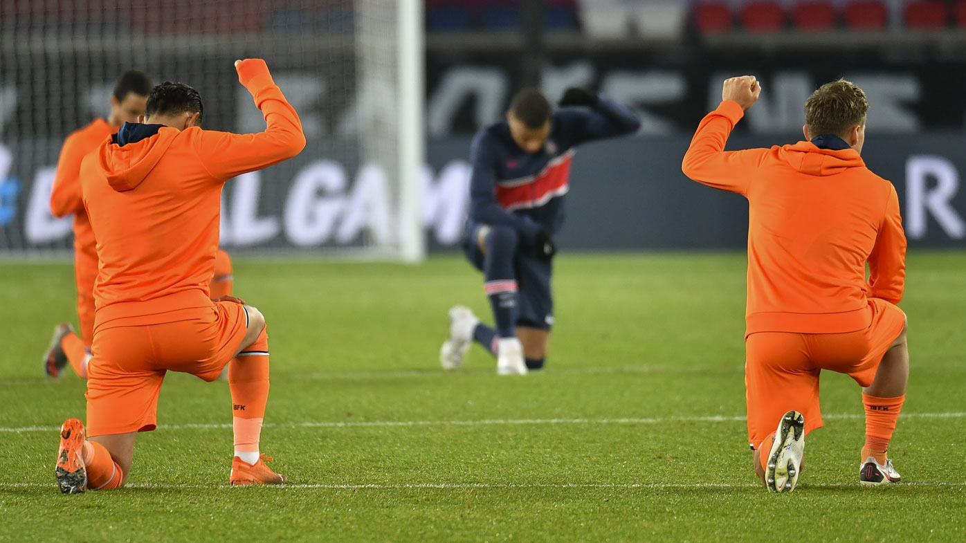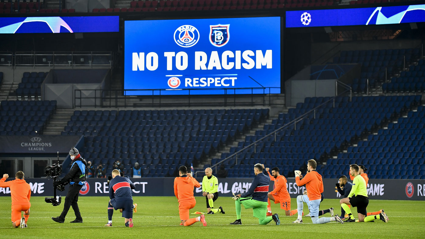 A day after walking off the field in protest, players from Paris Saint-Germain and Istanbul Basaksehir returned to the Parc des Princes and knelt together with match officials in a display of unity against racism.