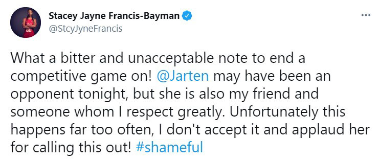 "@Jarten may have been an opponent tonight, but she is also my friend and someone whom I respect greatly. Unfortunately this happens far too often, I don't accept it and applaud her for calling this out! #shameful"