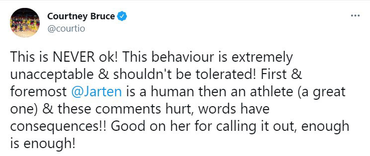 "First & foremost @Jarten is a human then an athlete (a great one) & these comments hurt, words have consequences!! Good on her for calling it out, enough is enough!"