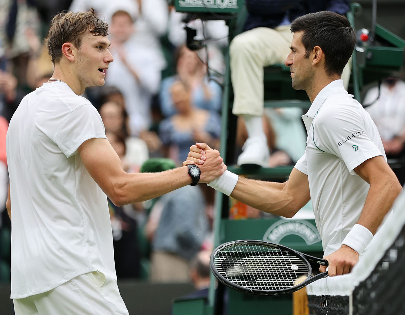 Djokovic took two tumbles onto his backside in the first set, losing his footing on the slick grass behind the baseline. This was his first competitive singles match on the surface since edging Roger Federer in the 2019 final.
