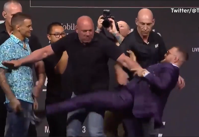 The fighters continued to trade insults until coming face-to-face, when the Irishman lashed out with a kick that didn't connect.